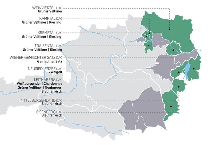 Niederösterreich (Nideresterraij) (67.000 ha): Incluye Wienviertel DAC, Kamptal DAC, Kremtal DAC, Wachau, Wagram, Traisental DAC, Carnuntum y Thermenregion.