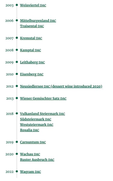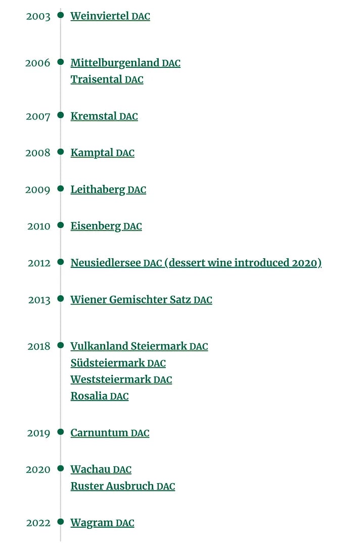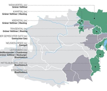 Dentro de los Qualitäswein también se incluyen los DAC (Districtus Austriae Controllatus) que no sólo delimita regiones, sino variedades autorizadas, mínimos niveles de alcohol, mínimo KMW, rendimientos, etc.
