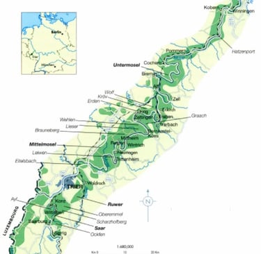 La pendiente más empinada de viñedos del mundo se encuentra en Mosel, en el viñedo Calmont, con inclinaciones que superan el 65%.