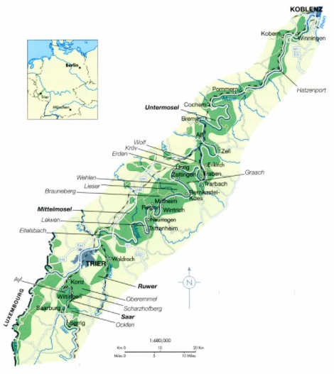 Clima: Continental, con veranos moderadamente cálidos e inviernos fríos. La influencia del río Mosel y la orientación sur de las laderas permiten que las viñas reciban la máxima exposición al sol, lo que es clave para la maduración de las uvas en una región tan al norte.